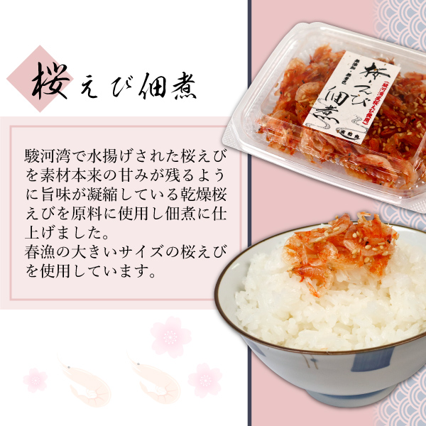 | 原材料 | ●駿河湾産桜えびの佃煮:桜えび(駿河湾産)、砂糖、食塩、みりん、ごま、酒 ●あみえびの佃煮:ツノナシオキアミ(岩手県産)、砂糖、酒、みりん、食塩、ごま ●生姜ちりめん:しらす、砂糖、酒、生姜、醤油(小麦、大豆含む)、みりん、食塩、ごま |