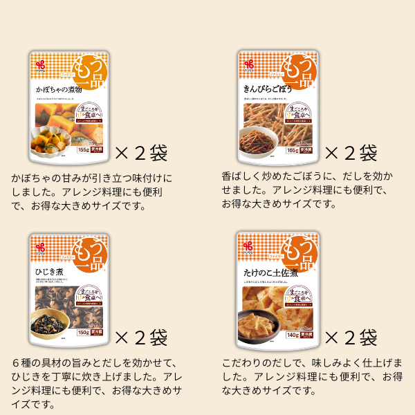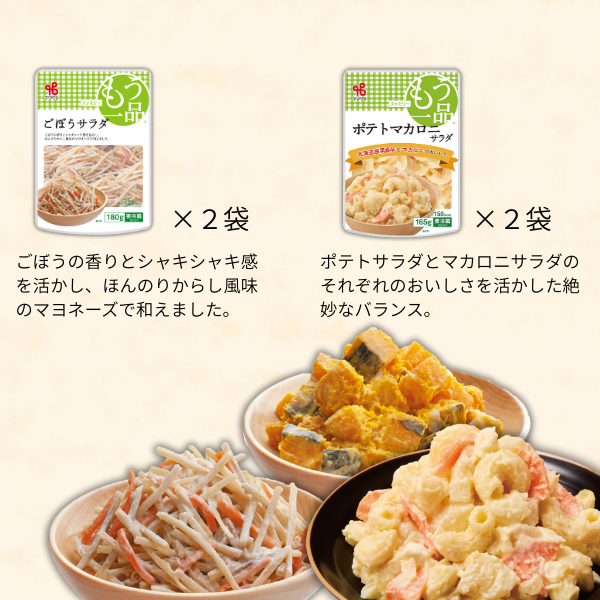 | 内容量 | ファミリー/きんぴらごぼう165g×2 ファミリー/ひじき煮150g×2 ファミリー/たけのこ土佐煮140g×2 ファミリー/かぼちゃの煮物155g×2 ファミリー/北海道男爵のポテトサラダ190g×2 ファミリー/ごぼうサラダ180g×2 ファミリー/かぼちゃサラダ150g×2 ファミリー/ツナ&コーンマカロニサラダ180g×2 ファミリー/たらこスパゲティサラダ180g×2 ファミリー/ポテトマカロニサラダ165g×2 計20袋 |
