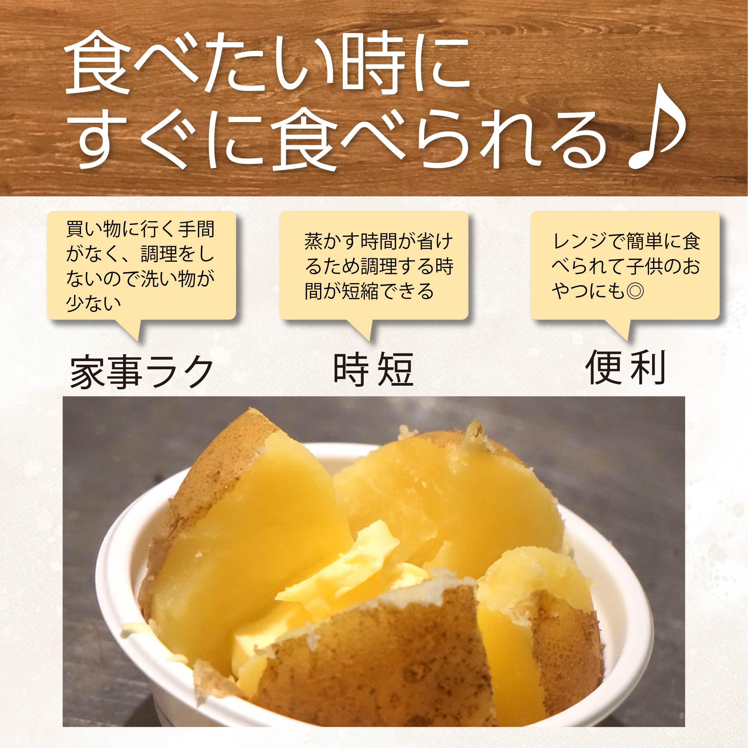 電子レンジで温めるだけでほっくほくのじゃがバターをお楽しみいただけます♪