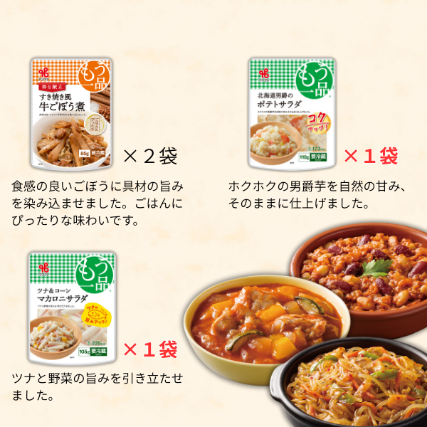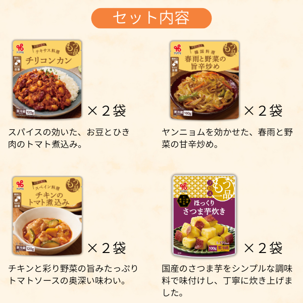 | 内容量 | ■世界の食卓シリーズ テキサス料理チリコンカン120g×2、韓国料理春雨と野菜の旨辛炒め160g×2、スペイン料理チキンのトマト煮込み120g×2 ■プラスもう一品シリーズ ほっくりさつま芋炊き100g×2 ■粋な献立シリーズ すき焼き風牛ごぼう煮85g×2 ■もう一品いろどりシリーズ 北海道男爵のポテトサラダ110g×1、ツナ&コーンマカロニサラダ105g×1 計12袋 |