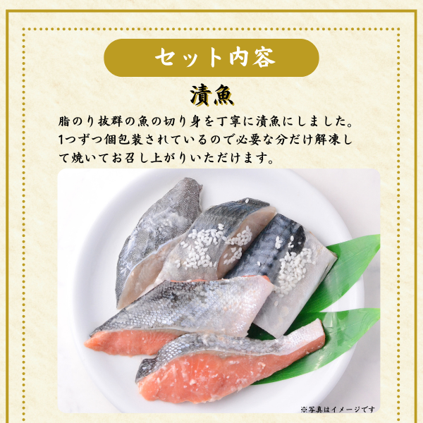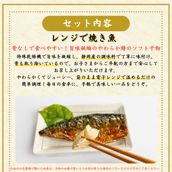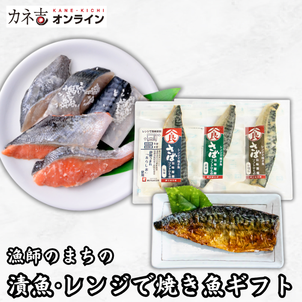 | 内容量 | レンジで焼き魚さば(塩)×1 レンジで焼き魚さば(醤油)×1 レンジで焼き魚さば(味噌)×1 漬魚5種×各1袋(例:サバ糀漬竹焼塩・あじ糀漬竹焼塩・銀ダラの粕漬・鮭の味噌漬・鮭の塩糀漬) 計8個 |