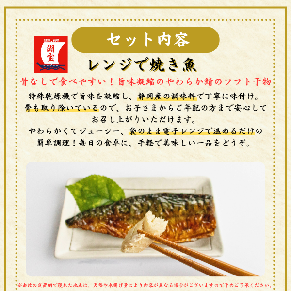 | 内容量 | レンジで焼き魚さば(塩)×2 レンジで焼き魚さば(醤油)×2 レンジで焼き魚さば(味噌)×2 計6個 |