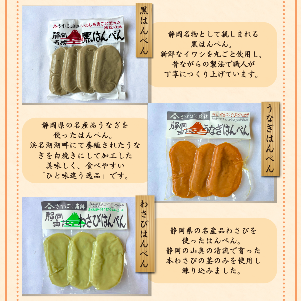 | 原材料 | ●黒はんぺん4枚入:いわし(国産)、たら、澱粉、砂糖、だし(鰹節・昆布・椎茸)、味醂、食塩 ●桜えび天3枚入:魚肉(輸入)、桜えび、砂糖、澱粉、味醂、食塩/調味料(アミノ酸等)、(一部にエビを含む) ●桜えび新上3枚入:魚肉(輸入)、桜えび、砂糖、澱粉、味醂、食塩/調味料(アミノ酸等)、(一部にエビを含む) ●いわし本丸9枚入:いわし(国産)、たら、澱粉、砂糖、だし(鰹節・昆布・椎茸)、味醂、食塩 ●桜えび本丸9枚入:魚肉(輸入)、桜えび、砂糖、澱粉、味醂、食塩/調味料(アミノ酸等)、(一部にエビを含む) ●手取り揚げ桜えび3枚入:魚肉(輸入)、桜えび、玉ねぎ、卵白、澱粉、砂糖、味醂、食塩/調味料(アミノ酸等)、(一部に卵・エビを含む) ●手取り揚げしらす3枚入:魚肉(輸入)、しらす、玉ねぎ、卵白、澱粉、砂糖、味醂、食塩/調味料(アミノ酸等)、(一部に卵を含む) ●うなぎはんぺん3枚入り:魚肉(輸入)、鰻(浜名湖産)、砂糖、果糖ぶどう糖液糖、醤油、食塩/加工澱粉、調味料(アミノ酸等)、(一部に小麦・大豆を含む) ●わさびはんぺん3枚入り:魚肉(輸入)、卵白、わさび茎、砂糖、澱粉、味醂、食塩、わさびパウダー/調味料(アミノ酸等)、(一部に卵・小麦を含む) ●静岡おでん竹皮包み:〔具〕鶏卵(国産)、大根、こんにゃく、ごぼう巻、牛筋、黒はんぺん、ちくわ 〔だし汁〕醤油、米発酵調味料、蛋白加水分解物、食塩、砂糖、鰹節、昆布エキス、チキンエキス、醸造酢、植物油/調味料(アミノ酸等)、カラメル色素、酸味料(クエン酸) 〔だし粉〕いわし煮干し、鯖節、青のり |