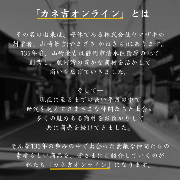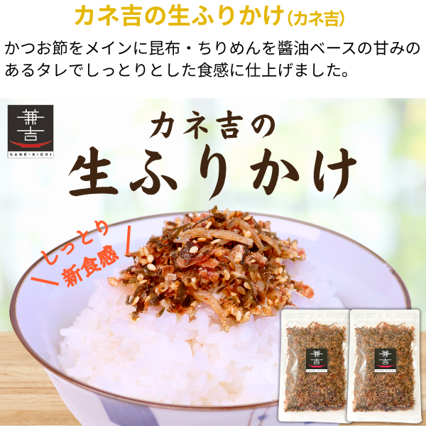 | 原材料 | ●カネ吉の生ふりかけ:ちりめん(国内製造)、鰹節(国内製造)、昆布(国産)、いりごま(国内製造)、砂糖、しょうゆ(大豆を含む)、酢(小麦を含む)、みりん、食塩 ●駿河湾産桜えびの天日干し:桜えび(駿河湾産) ●海苔いわし削り:いわしの煮干(いわし(国内))、乾のり(国産) ●カネ吉だし濃いこく:かつお、そうだ、さばのふし(国産)、こぶの粉末(国産) |