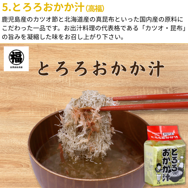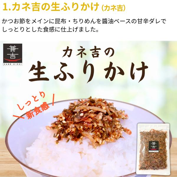 | 原材料 | ●カネ吉の生ふりかけ:ちりめん(国内製造)、鰹節(国内製造)、昆布(国産)、いりごま(国内製造)、砂糖、しょうゆ(大豆を含む)、酢(小麦を含む)、みりん 、食塩 ●カネ吉だし濃いこく:かつお、そうだ、さばのふし(国産)、こぶの粉末(国産) ●カネ吉だし香:かつおのかれふし(国産)、こぶの粉末(国産) ●おにぎりくん:乾のり ●桜えびの天日干し:桜えび(駿河湾産) ●静岡おでん:〔具〕鶏卵(国産)、大根、こんにゃく、午房巻き、牛筋、黒はんぺん、ちくわ 〔だし汁〕醤油、米発酵調味料、蛋白加水分解物、食塩、砂糖、鰹節、昆布エキス、チキンエキス、醸造酢、植物油/調味料(アミノ酸等)、カラメル色素、酸味料(クエン酸) 〔だし粉〕いわし煮干し、鯖節、青のり(原材料の一部に卵・小麦・大豆・鯖・牛肉・鶏肉を含む) ●とろろおかか汁:かつおのふし(国内製造)、昆布(北海道産)、醸造酢 ●海苔いわし削り:いわしの煮干(国産)、乾のり(国産) |