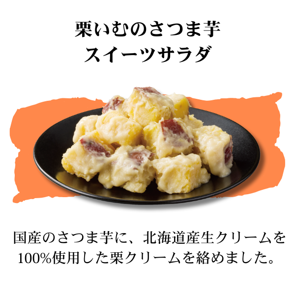 | 原材料名 | ●ほっくりさつま芋炊き:さつまいも(国産)、砂糖、食塩/焼ミョウバン ●栗いむのさつま芋スイーツサラダ:さつまいも(国産)、栗ペースト、砂糖、クリーム(乳成分を含む)、醸造酢、食塩、レモン果汁/クチナシ色素 ●ファミリータイプ/かぼちゃの煮物:かぼちゃ(メキシコ産又は国産又はニュージーランド産)、だし(さばを含む)、しょうゆ(小麦・大豆を含む)、砂糖、本みりん、食塩、清酒 ●北海道男爵のポテトサラダ:じゃがいも(北海道産)、マヨネーズ(卵・大豆を含む)、にんじん、たまねぎ、だし、醸造酢、砂糖、食塩、こしょう ●かぼちゃサラダ:かぼちゃ(国産又はメキシコ産又はその他)、マヨネーズ(卵・大豆を含む)、砂糖、醸造酢(りんごを含む)、食塩、食物繊維(オレンジを含む)、こしょう ●ごろっと男爵のポトフ:チキンブイヨン(国内製造)、キャベツ、じゃがいも、たまねぎ、鶏肉、にんじん、果実酒、ビーフブイヨン(小麦・ゼラチン・大豆を含む)、食塩、清酒、塩こうじ粉末、こしょう、ローレル ●黒毛牛(アンガス種)の肉じゃが:じゃがいも(北海道産)、たまねぎ、牛肉(アンガス種)、しらたき、しょうゆ(小麦・大豆を含む)、砂糖、にんじん、本みりん、だし、清酒、植物油/水酸化Ca |