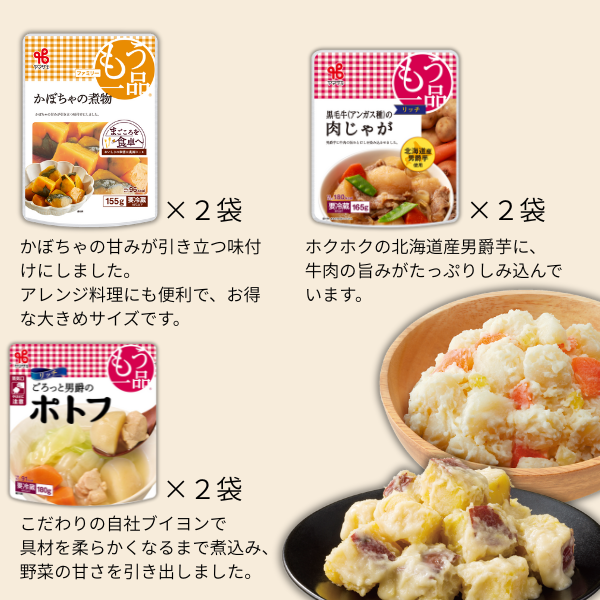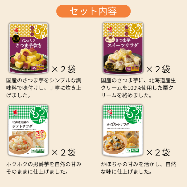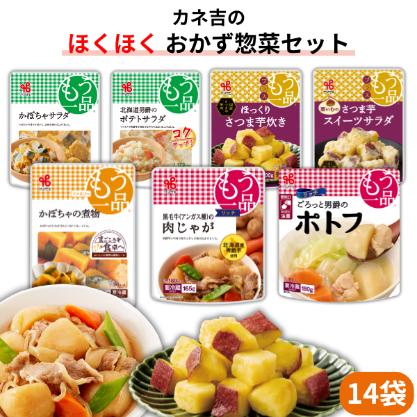 | 内容量 | ほっくりさつま芋炊き100g×2 栗いむのさつま芋スイーツサラダ70g×2 北海道男爵のポテトサラダ110g×2 かぼちゃサラダ70g×2 ファミリー/かぼちゃの煮物155g×2 黒毛牛(アンガス種)の肉じゃが165g×2 ごろっと男爵のポトフ180g×2 計14個 |