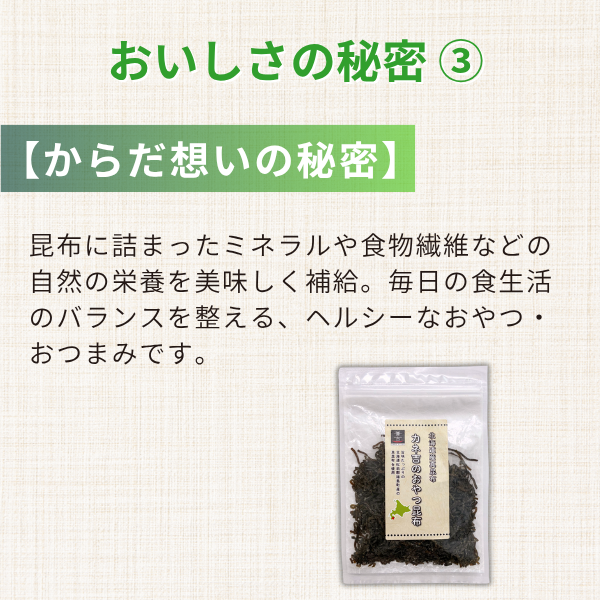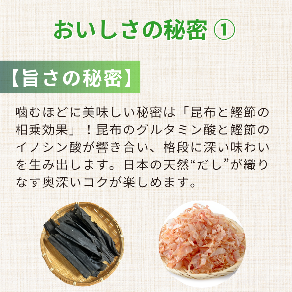 | 原材料名 | 昆布(北海道産)、砂糖、醤油、馬鈴薯澱粉、砂糖混合ぶどう糖果糖液糖、食塩、醸造調味料、かつお節エキス、麦芽水飴、酵母エキス、粉末昆布、鰹パウダー |