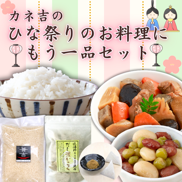 | 内容量 | カネ吉のヒノヒカリ600g(4合)×1 もう一品リッチ/だしが自慢の筑前煮150g×2 カネ吉だし 濃いこく(6g×10パック)×1 豆を食べよう/自然色三色豆180g×1 計5袋 |