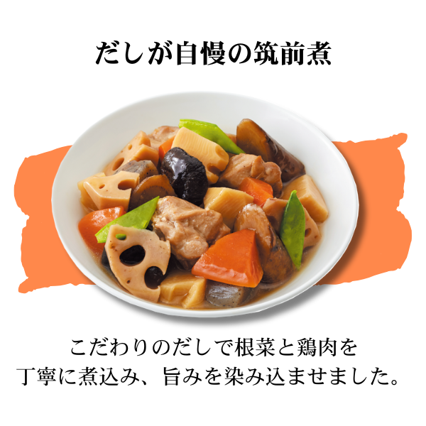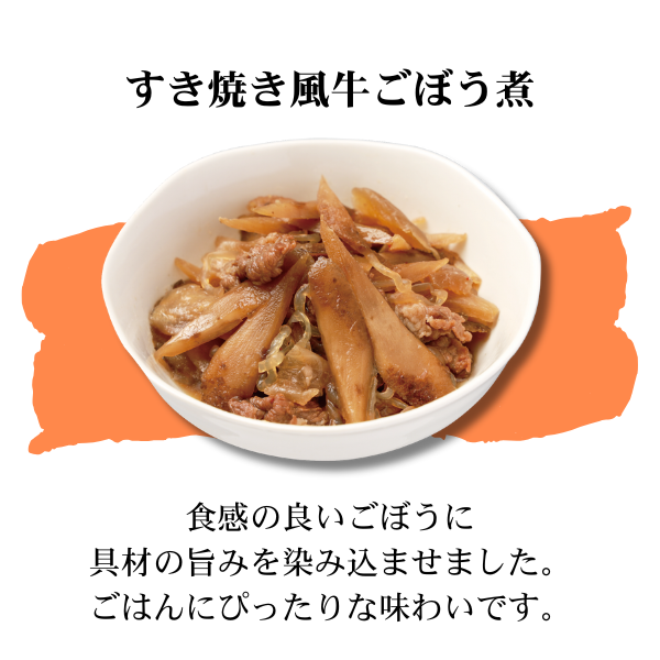 | 内容量 | カネ吉のヒノヒカリ450g×2 ひじき煮70g×2 きんぴらごぼう85g×2 たけのこ土佐煮75g×2 北海道男爵のポテトサラダ110g×2 すき焼き風牛ごぼう85g×2 黒毛牛(アンガス種)の肉じゃが165g×2 だしが自慢の筑前煮150g×2 計16袋 |