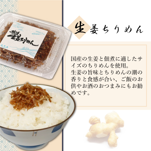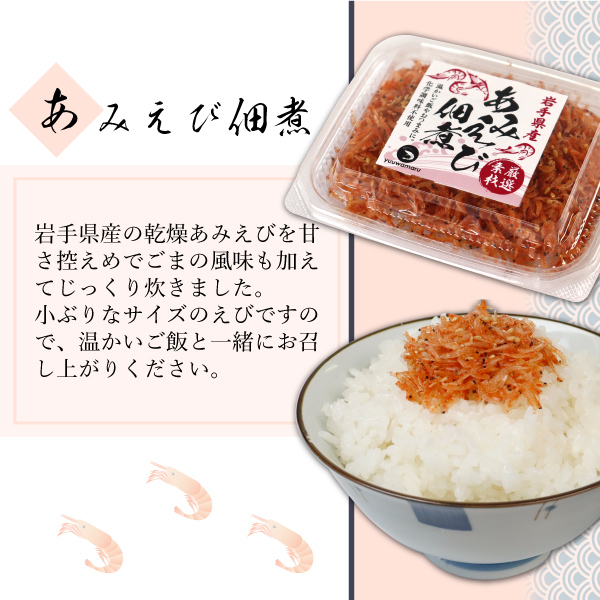 | 原材料 | ●駿河湾産桜えびの佃煮:桜えび(駿河湾産)、砂糖、食塩、みりん、ごま、酒 ●あみえびの佃煮:ツノナシオキアミ(岩手県産)、砂糖、酒、みりん、食塩、ごま ●生姜ちりめん:しらす、砂糖、酒、生姜、醤油(小麦、大豆含む)、みりん、食塩、ごま |