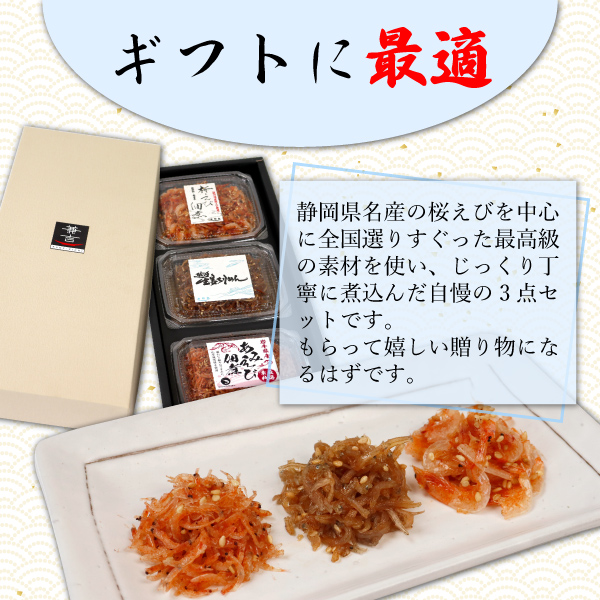 | 内容量 | 駿河湾産桜えびの佃煮40g×1 あみえびの佃煮50g×1 生姜ちりめん50g×1 計3個 |