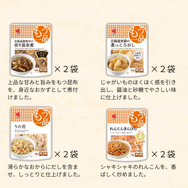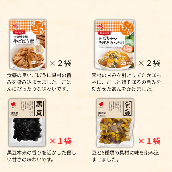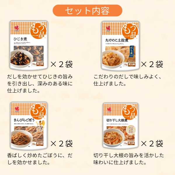 | 内容量 | すき焼き風牛ごぼう煮85g×2 かぼちゃのそぼろあんかけ100g×2 切り干し大根煮75g×2 れんこんきんぴら75g×2 たけのこ土佐煮75g×2 ひじき煮70g×2 きんぴらごぼう85g×2 うの花90g×2 北海道産昆布の切り昆布煮65g×2 北海道男爵の煮っころがし80g×2 かまど炊き風ごもく豆100g×1 かまど炊き風黒豆100g×1 計22袋 |