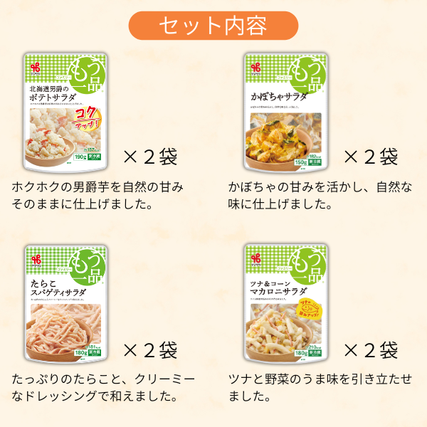 | 内容量 | ファミリー/きんぴらごぼう165g×2 ファミリー/ひじき煮150g×2 ファミリー/たけのこ土佐煮140g×2 ファミリー/かぼちゃの煮物155g×2 ファミリー/北海道男爵のポテトサラダ190g×2 ファミリー/ごぼうサラダ180g×2 ファミリー/かぼちゃサラダ150g×2 ファミリー/ツナ&コーンマカロニサラダ180g×2 ファミリー/たらこスパゲティサラダ180g×2 ファミリー/ポテトマカロニサラダ165g×2 計20袋 |