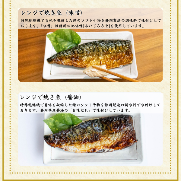 | 内容量 | レンジで焼き魚さば(塩)×2 レンジで焼き魚さば(醤油)×2 レンジで焼き魚さば(味噌)×2 計6個 |