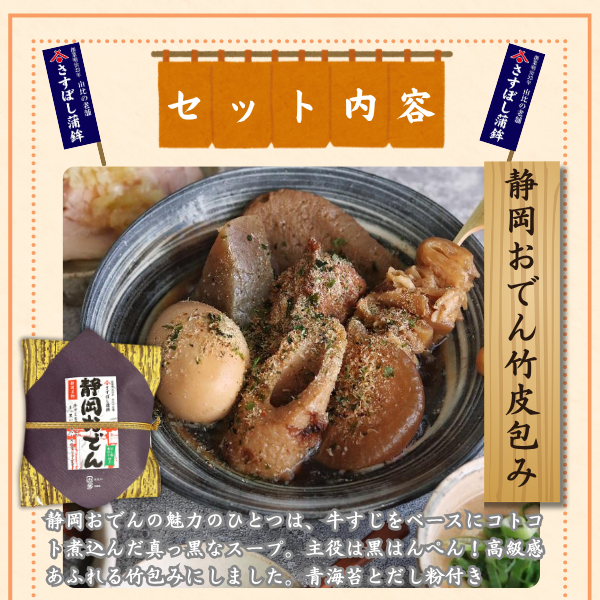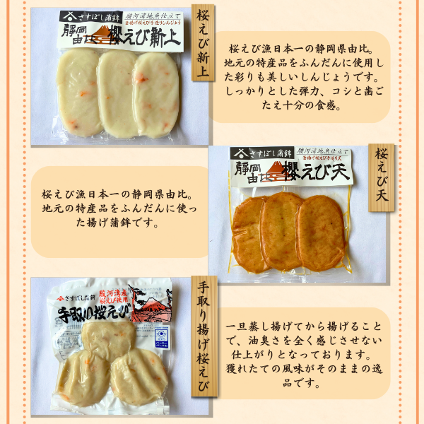 | 内容量 | 黒はんぺん4枚入り×1 桜えび天3枚入り×1 桜えび新上3枚入り×1 いわし本丸9枚入り×1 桜えび本丸9枚入り×1 手取り揚げ桜えび3枚入り×1 手取り揚げしらす3枚入り×1 うなぎはんぺん3枚入り×1 わさびはんぺん3枚入り×1 静岡おでん竹皮包み365g×1 計10個 |