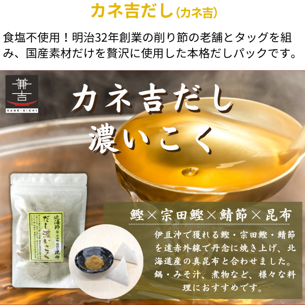 | 原材料 | ●カネ吉の生ふりかけ:ちりめん(国内製造)、鰹節(国内製造)、昆布(国産)、いりごま(国内製造)、砂糖、しょうゆ(大豆を含む)、酢(小麦を含む)、みりん、食塩 ●駿河湾産桜えびの天日干し:桜えび(駿河湾産) ●海苔いわし削り:いわしの煮干(いわし(国内))、乾のり(国産) ●カネ吉だし濃いこく:かつお、そうだ、さばのふし(国産)、こぶの粉末(国産) |