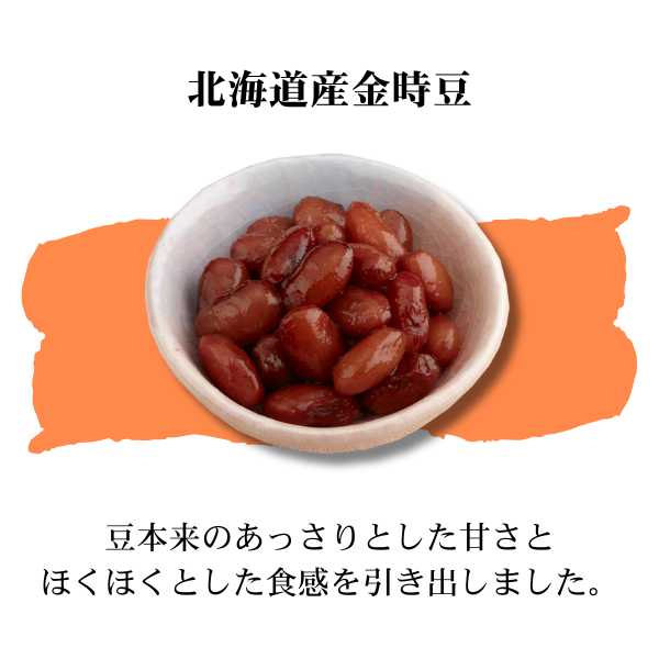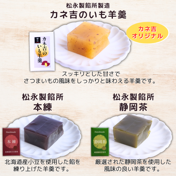| 原材料 | ●北海道産黒豆(小):黒大豆(北海道産)、砂糖、しょうゆ(小麦を含む)、食塩/硫酸第一鉄 ●北海道産金時豆(小):金時豆(北海道産)、砂糖、食塩、しょうゆ(小麦・大豆を含む) ●北海道産昆布豆(小):大豆(北海道産)、砂糖、こんぶ(北海道産)、しょうゆ(小麦を含む)、食塩 ●カネ吉のいも羊羹:甜菜糖(北海道製造)、さつまいもペースト(国内製造)、水飴、白いんげん豆、寒天/焼ミョウバン ●一口羊羹(本練):氷砂糖(国産)、小豆(北海道産)、砂糖結合水飴、水飴、寒天 ●一口羊羹(静岡茶):氷砂糖(国産)、白いんげん豆(北海道産)、砂糖結合水飴、水飴、茶、寒天 |