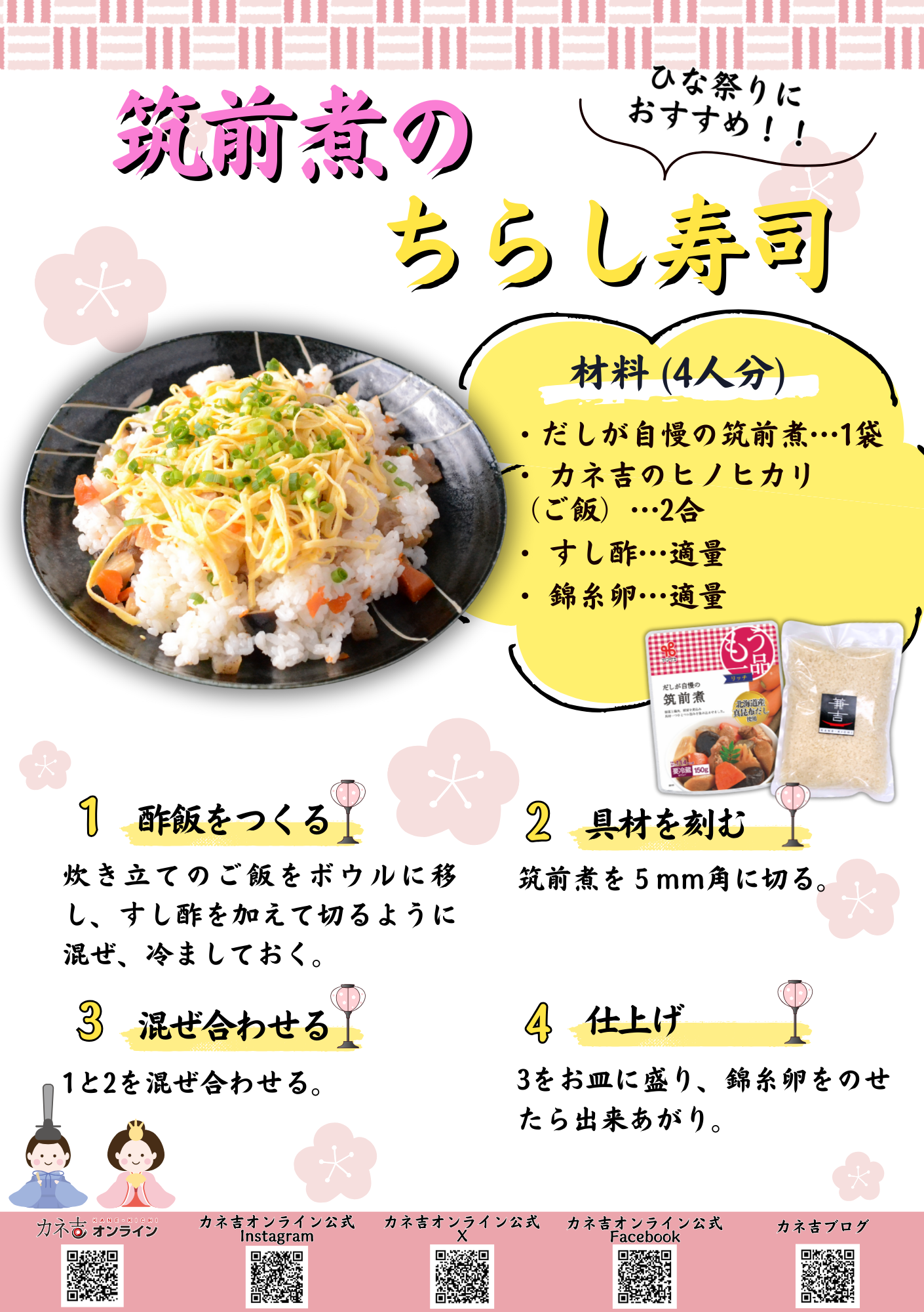 | 保存方法 | もう一品リッチ/だしが自慢の筑前煮:要冷蔵(10℃以下) カネ吉のヒノヒカリ、カネ吉だし 濃いこく、豆を食べよう/自然色三色豆:直射日光、高温多湿を避け、できるだけ涼しい場所に保存してください。 |